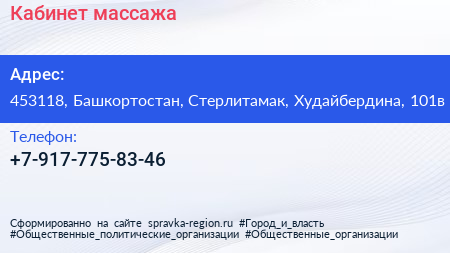 Кабинет массажа по адресу 453118, Башкортостан, Стерлитамак, Худайбердина, 101в в дальнейшем Организация, размещена в следующих категориях: