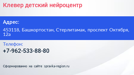 Клевер, детский нейроцентр по адресу 453118, Башкортостан, Стерлитамак, проспект Октября, 12а в дальнейшем Организация, размещена в следующих категориях: