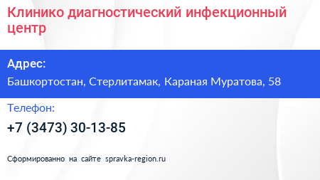 Клинико-диагностический инфекционный центр по адресу Башкортостан, Стерлитамак, Караная Муратова, 58 в дальнейшем Организация, размещена в следующих категориях: