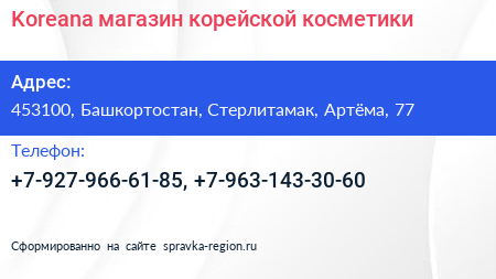 Koreana, магазин корейской косметики по адресу 453100, Башкортостан, Стерлитамак, Артёма, 77 в дальнейшем Организация, размещена в следующих категориях: