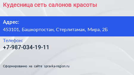 Кудесница, сеть салонов красоты по адресу 453101, Башкортостан, Стерлитамак, Мира, 2Б в дальнейшем Организация, размещена в следующих категориях: