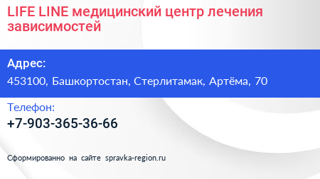 LIFE LINE, медицинский центр лечения зависимостей по адресу 453100, Башкортостан, Стерлитамак, Артёма, 70 в дальнейшем Организация, размещена в следующих категориях: