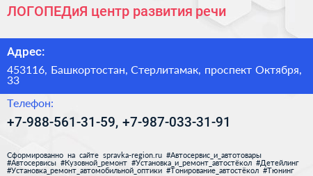 ЛОГОПЕДиЯ, центр развития речи по адресу 453116, Башкортостан, Стерлитамак, проспект Октября, 33 в дальнейшем Организация, размещена в следующих категориях: