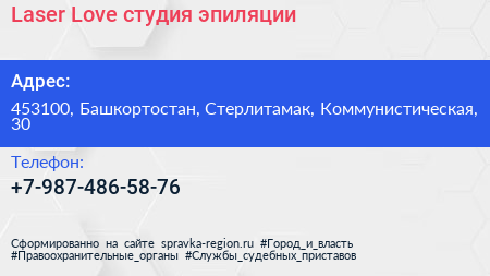Laser Love, студия эпиляции по адресу 453100, Башкортостан, Стерлитамак, Коммунистическая, 30 в дальнейшем Организация, размещена в следующих категориях: