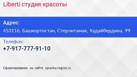 Liberti, студия красоты по адресу 453116, Башкортостан, Стерлитамак, Худайбердина, 99 в дальнейшем Организация, размещена в следующих категориях: