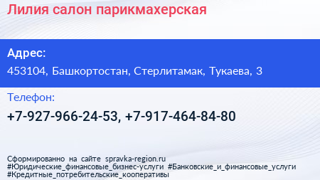Лилия, салон-парикмахерская по адресу 453104, Башкортостан, Стерлитамак, Тукаева, 3 в дальнейшем Организация, размещена в следующих категориях: