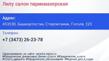 Лилу, салон-парикмахерская по адресу 453130, Башкортостан, Стерлитамак, Гоголя, 121 в дальнейшем Организация, размещена в следующих категориях: