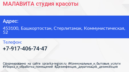 МАЛАВИТА, студия красоты по адресу 453100, Башкортостан, Стерлитамак, Коммунистическая, 52 в дальнейшем Организация, размещена в следующих категориях: