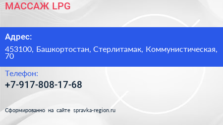 МАССАЖ LPG по адресу 453100, Башкортостан, Стерлитамак, Коммунистическая, 70 в дальнейшем Организация, размещена в следующих категориях: