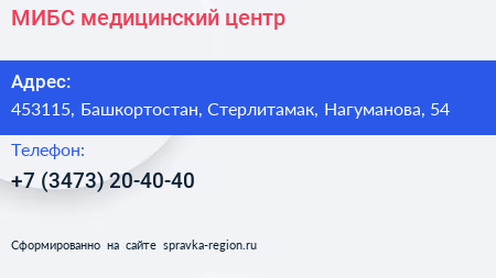 МИБС, медицинский центр по адресу 453115, Башкортостан, Стерлитамак, Нагуманова, 54 в дальнейшем Организация, размещена в следующих категориях: