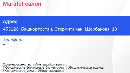 Marafet, салон по адресу 453126, Башкортостан, Стерлитамак, Щербакова, 13 в дальнейшем Организация, размещена в следующих категориях:
