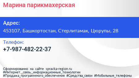 Марина, парикмахерская по адресу 453107, Башкортостан, Стерлитамак, Цюрупы, 28 в дальнейшем Организация, размещена в следующих категориях: