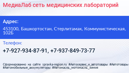 МедиаЛаб, сеть медицинских лабораторий по адресу 453100, Башкортостан, Стерлитамак, Коммунистическая, 102Б в дальнейшем Организация, размещена в следующих категориях: