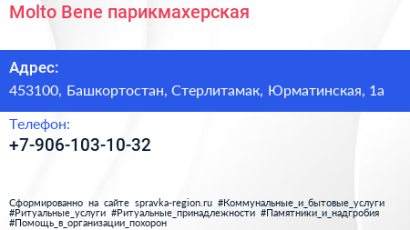 Molto Bene, парикмахерская по адресу 453100, Башкортостан, Стерлитамак, Юрматинская, 1а в дальнейшем Организация, размещена в следующих категориях: