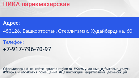 НИКА, парикмахерская по адресу 453126, Башкортостан, Стерлитамак, Худайбердина, 60 в дальнейшем Организация, размещена в следующих категориях: