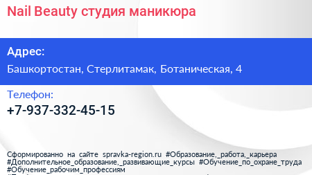 Nail Beauty, студия маникюра по адресу Башкортостан, Стерлитамак, Ботаническая, 4 в дальнейшем Организация, размещена в следующих категориях: