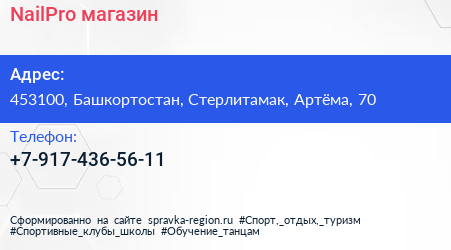 NailPro, магазин по адресу 453100, Башкортостан, Стерлитамак, Артёма, 70 в дальнейшем Организация, размещена в следующих категориях: