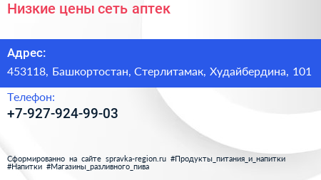 Низкие цены, сеть аптек по адресу 453118, Башкортостан, Стерлитамак, Худайбердина, 101 в дальнейшем Организация, размещена в следующих категориях: