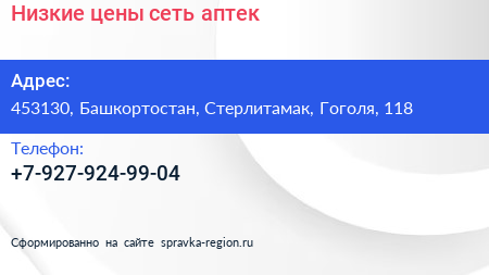 Низкие цены, сеть аптек по адресу 453130, Башкортостан, Стерлитамак, Гоголя, 118 в дальнейшем Организация, размещена в следующих категориях: