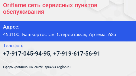 Oriflame, сеть сервисных пунктов обслуживания по адресу 453100, Башкортостан, Стерлитамак, Артёма, 63а в дальнейшем Организация, размещена в следующих категориях: