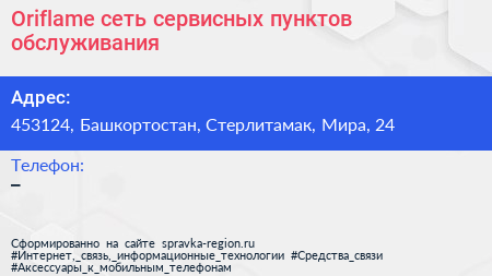 Oriflame, сеть сервисных пунктов обслуживания по адресу 453124, Башкортостан, Стерлитамак, Мира, 24 в дальнейшем Организация, размещена в следующих категориях: