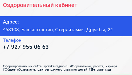 Оздоровительный кабинет по адресу 453103, Башкортостан, Стерлитамак, Дружбы, 24 в дальнейшем Организация, размещена в следующих категориях:
