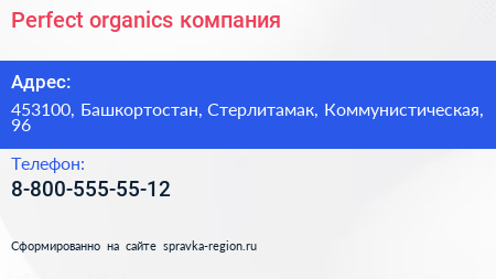 Perfect organics, компания по адресу 453100, Башкортостан, Стерлитамак, Коммунистическая, 96 в дальнейшем Организация, размещена в следующих категориях: