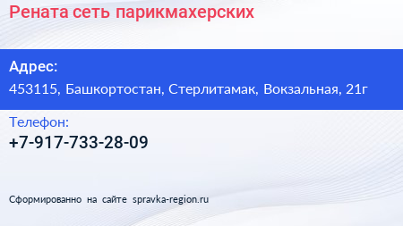 Рената, сеть парикмахерских по адресу 453115, Башкортостан, Стерлитамак, Вокзальная, 21г в дальнейшем Организация, размещена в следующих категориях:
