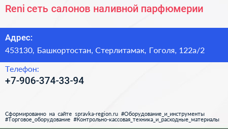 Reni, сеть салонов наливной парфюмерии по адресу 453130, Башкортостан, Стерлитамак, Гоголя, 122а/2 в дальнейшем Организация, размещена в следующих категориях: