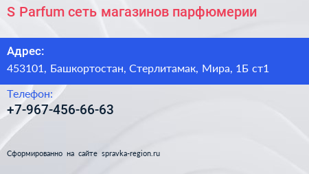 S-Parfum, сеть магазинов парфюмерии по адресу 453101, Башкортостан, Стерлитамак, Мира, 1Б ст1 в дальнейшем Организация, размещена в следующих категориях: