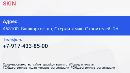 SKIN по адресу 453100, Башкортостан, Стерлитамак, Строителей, 26 в дальнейшем Организация, размещена в следующих категориях: