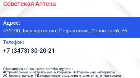 Советская Аптека по адресу 453100, Башкортостан, Стерлитамак, Строителей, 65 в дальнейшем Организация, размещена в следующих категориях: