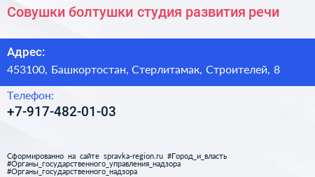 Совушки-болтушки, студия развития речи по адресу 453100, Башкортостан, Стерлитамак, Строителей, 8 в дальнейшем Организация, размещена в следующих категориях: