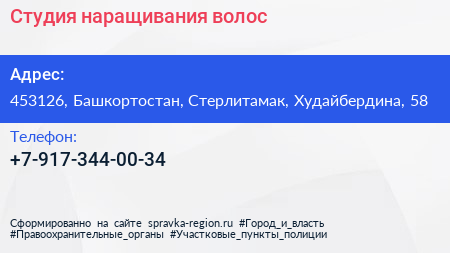 Студия наращивания волос по адресу 453126, Башкортостан, Стерлитамак, Худайбердина, 58 в дальнейшем Организация, размещена в следующих категориях: