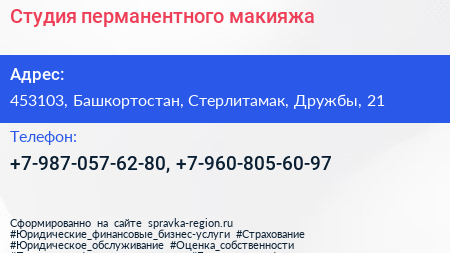 Студия перманентного макияжа по адресу 453103, Башкортостан, Стерлитамак, Дружбы, 21 в дальнейшем Организация, размещена в следующих категориях: