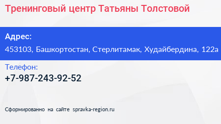 Тренинговый центр Татьяны Толстовой по адресу 453103, Башкортостан, Стерлитамак, Худайбердина, 122а в дальнейшем Организация, размещена в следующих категориях:
