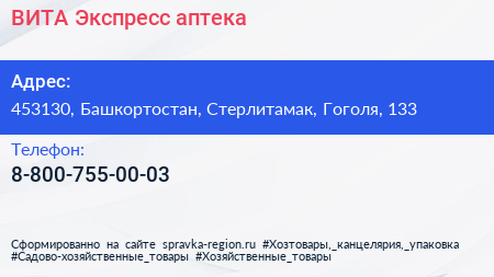 ВИТА Экспресс, аптека по адресу 453130, Башкортостан, Стерлитамак, Гоголя, 133 в дальнейшем Организация, размещена в следующих категориях: