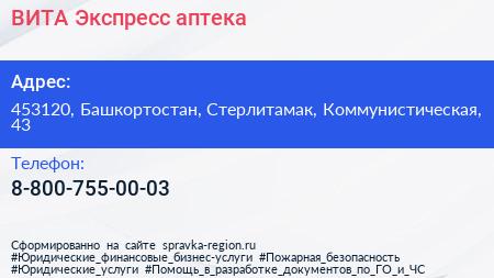 ВИТА Экспресс, аптека по адресу 453120, Башкортостан, Стерлитамак, Коммунистическая, 43 в дальнейшем Организация, размещена в следующих категориях: