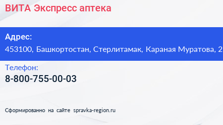 ВИТА Экспресс, аптека по адресу 453100, Башкортостан, Стерлитамак, Караная Муратова, 2 в дальнейшем Организация, размещена в следующих категориях: