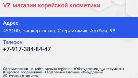 VZ, магазин корейской косметики по адресу 453100, Башкортостан, Стерлитамак, Артёма, 98 в дальнейшем Организация, размещена в следующих категориях: