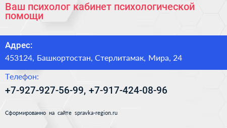 Ваш психолог, кабинет психологической помощи по адресу 453124, Башкортостан, Стерлитамак, Мира, 24 в дальнейшем Организация, размещена в следующих категориях: