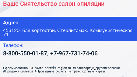 Ваше Сиятельство, салон эпиляции по адресу 453120, Башкортостан, Стерлитамак, Коммунистическая, 71 в дальнейшем Организация, размещена в следующих категориях: