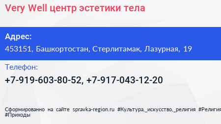 Very Well, центр эстетики тела по адресу 453151, Башкортостан, Стерлитамак, Лазурная, 19 в дальнейшем Организация, размещена в следующих категориях: