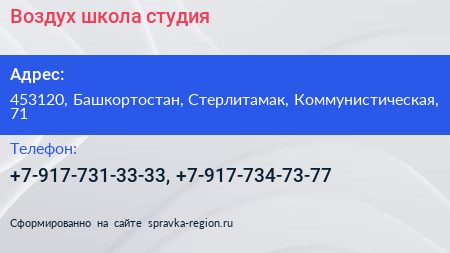 Воздух, школа-студия по адресу 453120, Башкортостан, Стерлитамак, Коммунистическая, 71 в дальнейшем Организация, размещена в следующих категориях:
