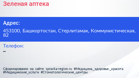 Зеленая аптека по адресу 453100, Башкортостан, Стерлитамак, Коммунистическая, 82 в дальнейшем Организация, размещена в следующих категориях: