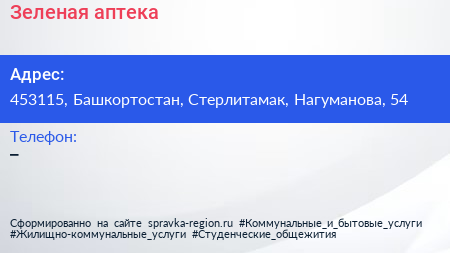 Зеленая аптека по адресу 453115, Башкортостан, Стерлитамак, Нагуманова, 54 в дальнейшем Организация, размещена в следующих категориях: