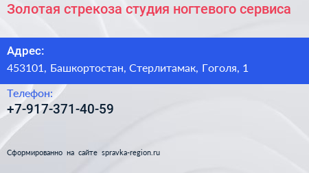 Золотая стрекоза, студия ногтевого сервиса по адресу 453101, Башкортостан, Стерлитамак, Гоголя, 1 в дальнейшем Организация, размещена в следующих категориях: