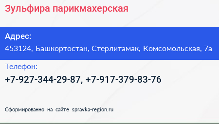 Зульфира, парикмахерская по адресу 453124, Башкортостан, Стерлитамак, Комсомольская, 7а в дальнейшем Организация, размещена в следующих категориях: