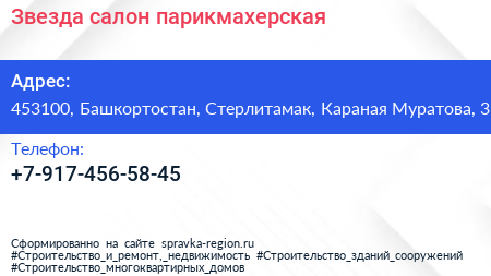 Звезда, салон-парикмахерская по адресу 453100, Башкортостан, Стерлитамак, Караная Муратова, 3 в дальнейшем Организация, размещена в следующих категориях: