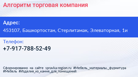 Алгоритм, торговая компания по адресу 453107, Башкортостан, Стерлитамак, Элеваторная, 1и в дальнейшем Организация, размещена в следующих категориях: